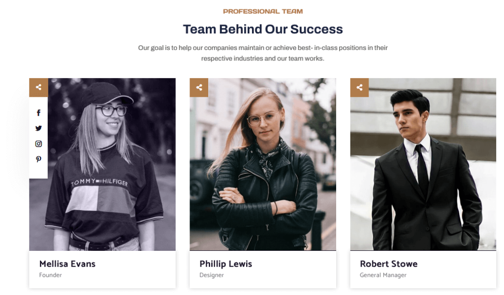 Ezen túlmenően az egyes elrendezések egyedi lebegtetési effektusai egy kis interaktivitást adnak, így a csapat prezentációja dinamikus és vonzó. Az elrendezések teljesen érzékenyek és mobilra optimalizáltak, és zökkenőmentesen alkalmazkodnak a különböző képernyőméretekhez.